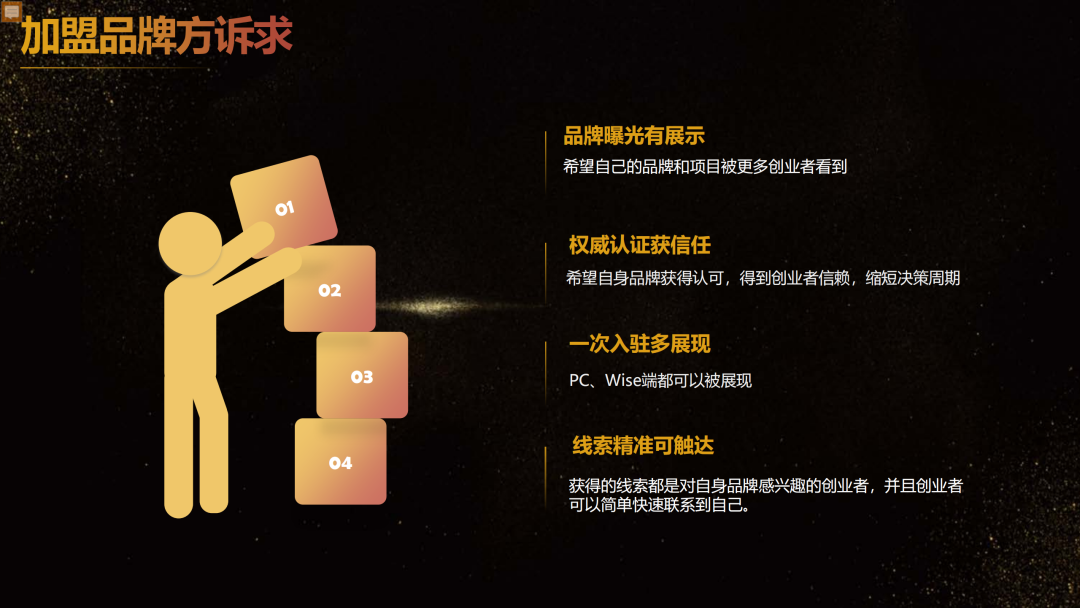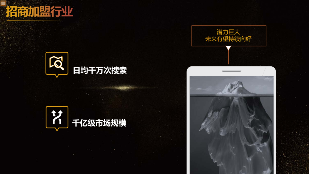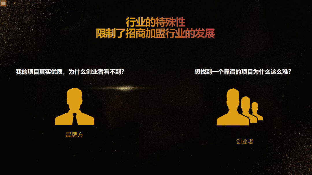 加盟星平臺依托于百度構建的一套權威真實認證體系,匯集加盟商豐富的項目信息,將創業者的海量檢索需求與加盟項目信息精準匹配,幫助創業者更高效地找到理想中的投資項目,降低品牌方獲取線索的成本,提升加盟成單轉化率。